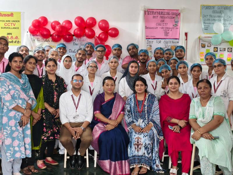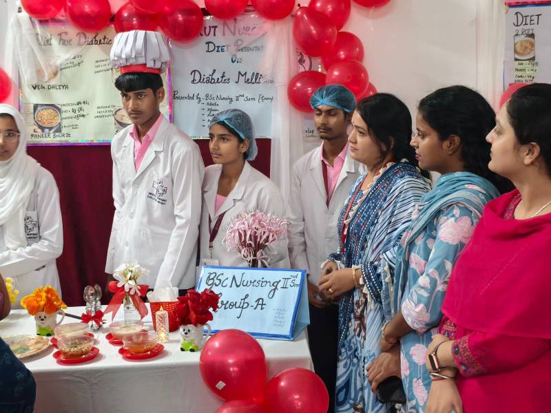 The event was held at the Corridor Area of Nutrition Lab which started at 12:00pm and ended at 02:00pm. Total number of participants are 61 students and they are further divided into 7 group. Each group has planned a menu to meet the nutritional requirement of people based on selected disease condition on normal RDA value. The students of ANM & GNM 1st Year (Batch 2024-25) presented their topics such as Diet on Hypertension, Diabetes, Malnutrition, Cardiovascular disease, Renal disease, Anemia, Diarrhea in corridor area of Nutrition Lab and food exhibition on Diet were presented by students group wise. All the faculty was part of this program.This Program was evaluated based on the check list by Ms. Neha Nursing tutor and Ms.Himani PG Tutor of Meerut Nursing College. Overall the Program was conducted well and appreciated by the audience. Through this Program the Students gain knowledge regarding the nutritious diet according to disease condition. The whole team winded up the program by 03:00pm.