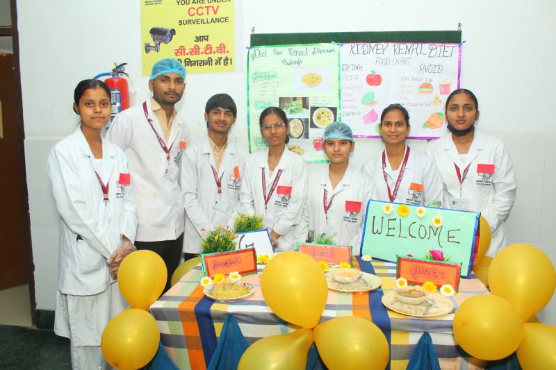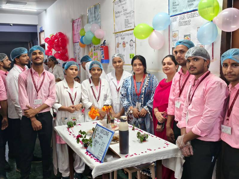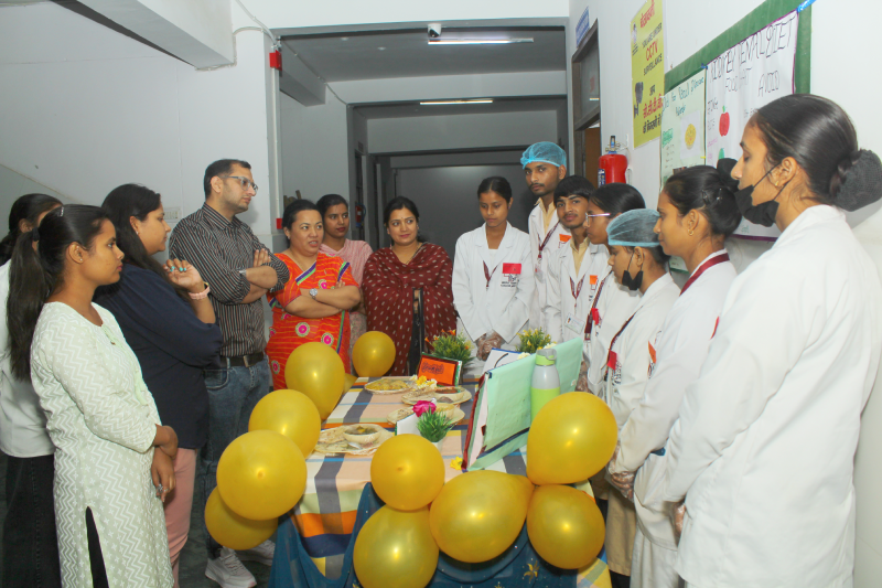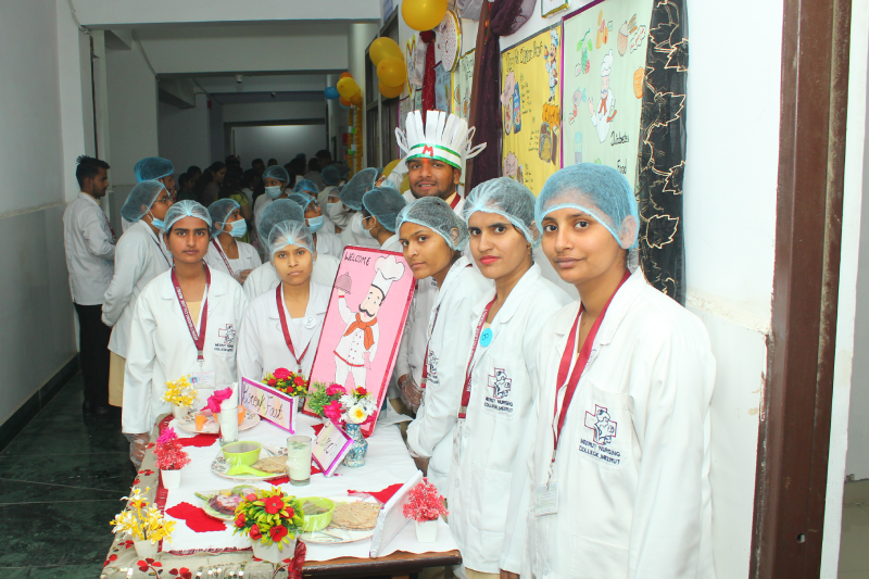 The event was held at the Corridor Area of Nutrition Lab which started at 12:00pm and ended at 02:00pm. Total number of participants are 61 students and they are further divided into 7 group. Each group has planned a menu to meet the nutritional requirement of people based on selected disease condition on normal RDA value. The students of ANM & GNM 1st Year (Batch 2024-25) presented their topics such as Diet on Hypertension, Diabetes, Malnutrition, Cardiovascular disease, Renal disease, Anemia, Diarrhea in corridor area of Nutrition Lab and food exhibition on Diet were presented by students group wise. All the faculty was part of this program.This Program was evaluated based on the check list by Ms. Neha Nursing tutor and Ms.Himani PG Tutor of Meerut Nursing College. Overall the Program was conducted well and appreciated by the audience. Through this Program the Students gain knowledge regarding the nutritious diet according to disease condition. The whole team winded up the program by 03:00pm.