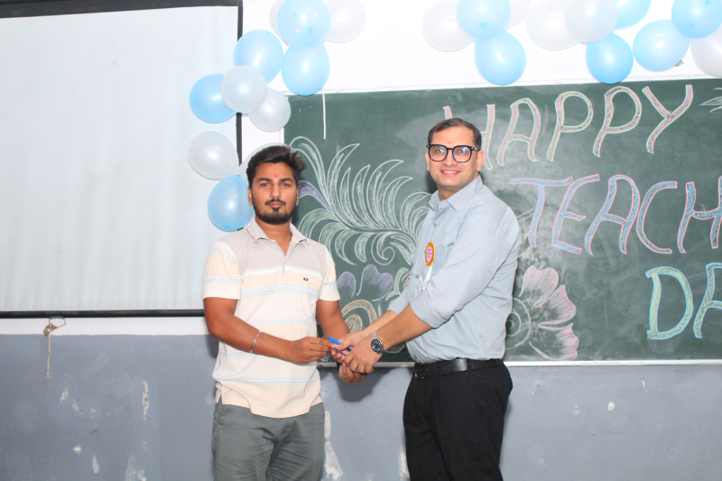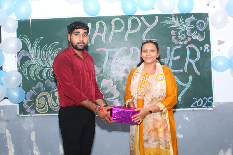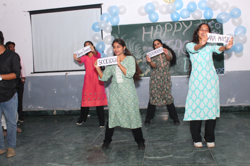 The program was initiated with the Saraswati Vandana by the girls of bsc 1st semester and various cultural activities like dance song poetry shayari are performed by the students. Mr Nitin Yadav and Khushi of b.sc first and second year respectively delivers beautiful speech. Between program student arranged refreshment for the respected faculties as well as students. In between various games like cup building, tongue twister, corporate fun and more are held for faculties in which Ms. Palak Chauhan and Ms. Ashi Rawat were the winners. All the teachers enjoyed and appreciated the program. At the end students distributed the gift to the respected teachers and vote of thanks.